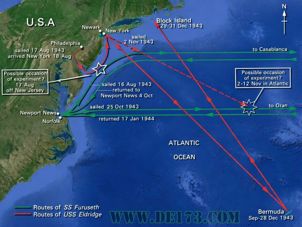 Edward Dudgeon served on the U.S.S. Engstrom (DE 50) from June 1943 on. Mr. Dudgeon comments that the Eldridge left Philadelphia bound for Norfolk via the Chesapeake-Delaware canal around 11:00 pm. The Engstrom (the ship Mr. Dudgeon served on) passed the Eldridge (returning to Philadelphia) on its way to Norfolk early the next morning. The Eldridge’s round trip is estimated at six hours. To the Merchant ships the same trip would take two days, as they did not use the same channel. Therefore they would perceive that it would be impossible for the Eldridge to complete the trip in the time elapsed. In other words, the Eldridge took a “short-cut” and now everybody thinks it teleported![13a]